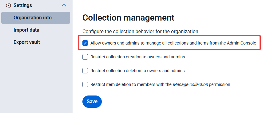 Restrict item deletion to members with the Manage collection permission is disabled (unchecked).