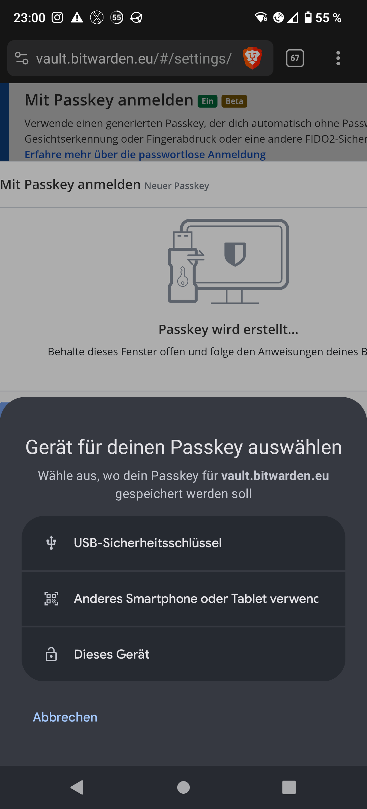 By the way, what browser do you use? Chromium-based? [I ask because e.g. Firefox doesn’t have so-called PRF (pseudo-random function) yet, so that you couldn’t create a fully functional passkey for login to Bitwarden “with encryption” because for that, PRF is needed. Chrome and Brave for example do have PRF]