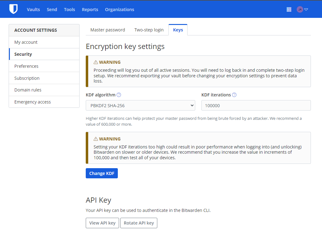 Has anyone solved this issue before? I click on the button, it takes me to my Keys page, and then I click “Change KDF” - that asks me to authenticate, which logs me into BitWarden again, and I am back to my home page where I get the warning. Endless loop - rinse and repeat.