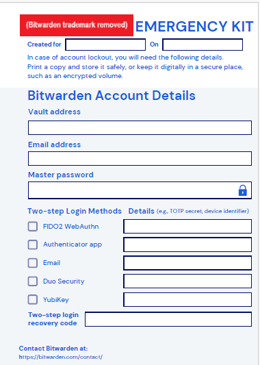 I recently created a simple document for storing Bitwarden account details. Following some requests for a Bitwarden Emergency Kit (though I know these requests are for an in-app creation feature), I decided to enhance the document’s design using BW’s colors and logo, and share it here.