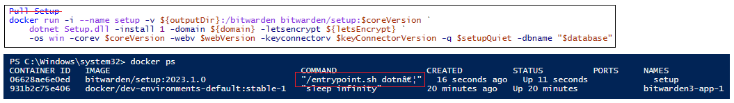 I’m doing a Windows self-hosting installation. I’m following the Windows installation instructions exactly. I execute the ‘bitwarden.ps1 -install’ command. I get and answer prompts for Domain name, Let’s Encrypt, and database name. The ‘docker.io/bitwarden/setup:2023.1.0’ is successfully pulled. But then, instead of displaying the ‘Enter your installation ID’ prompt, it outputs “[?1h=” and, as I eventually realized, it waits for input. One time I was able to enter/paste the Installation ID and Key at the cursor, but every other time it locks up and doesn’t accept any type of keyboard input other than a CTRL-C which ends the script. Based on my research, it appears that the “[?1h=” output may be some type of control or escape characters that are being output to the pseudo-TTY while attempting to output the Installation ID prompt.
