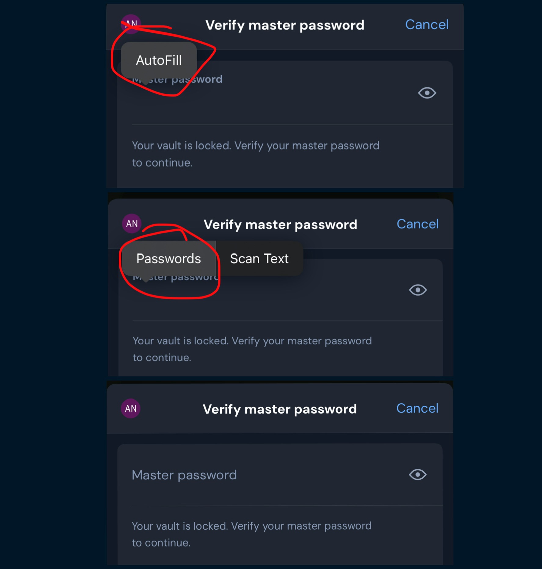 Then I press and hold the Master Password and then click on the “Autofill” Button. It prompts me asking which Password Manager I want to use, so I select “Passwords” app.