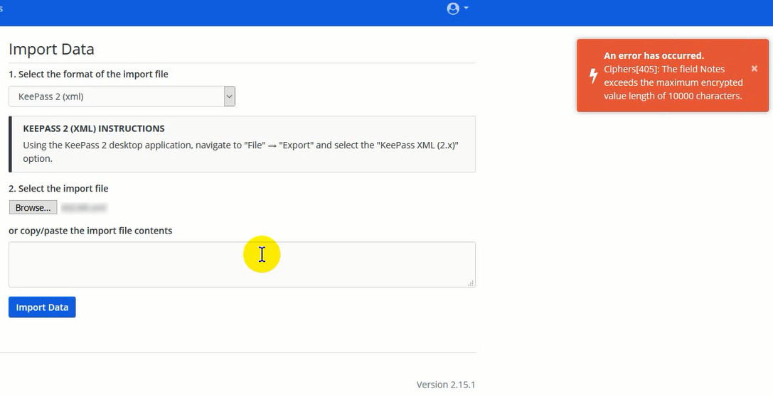 I can’t import data from KeePass, the error I get is on the screenshot. The error message says ‘The field Notes exceeds the maximum encrypted value length of 10000 characters’. I sorted all records in Keepass database by notes and went one by one through each containing notes and wherever a note seemed to be long I copied the text and measured the number of characters in Notepad++. Not a single note was longer than 1132 characters. Anyway, I removed those notes as well but still my import fails.