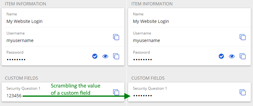 - This is a security improvement as custom fields and notes may contain sensitive data like answers to security questions and 2FA backup codes. It’s better not to expose those values when using them when you have someone looking at your screen.