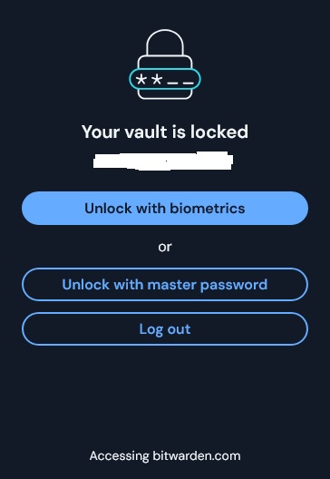 Then I open web browser (mozilla) and click on bitwarden icon unlock the vault via firefox extension. Bitwarden pops up a window where I choose biometrics again - I can see IR camera blinking and small window pops up to confirm - what I do: I click OK. And this time biometrics does not work. Extension in firefox remains locked. I can unlock it with PIN or main password.